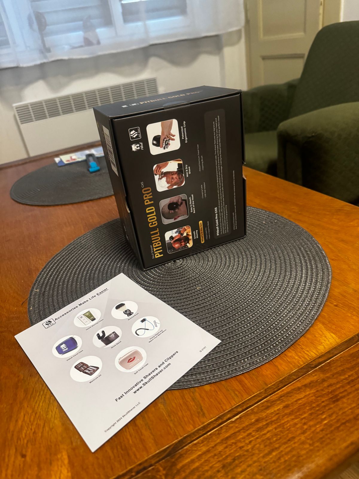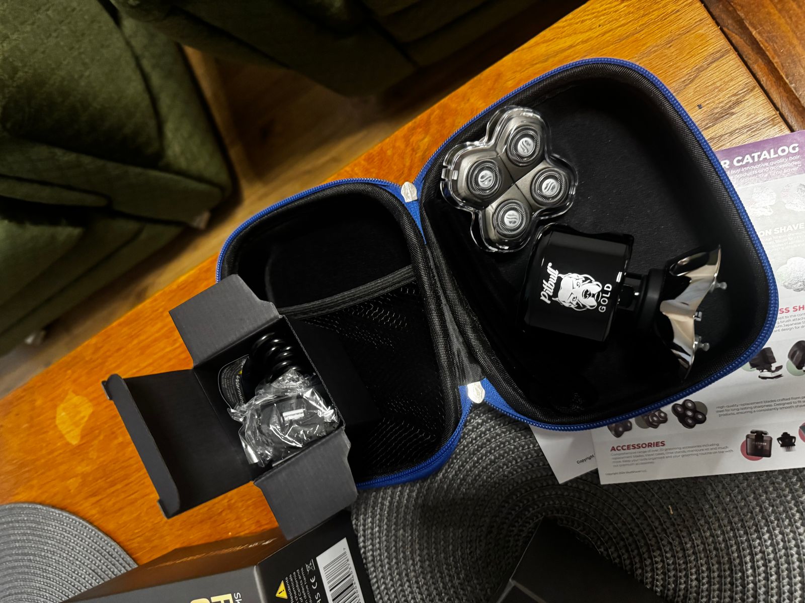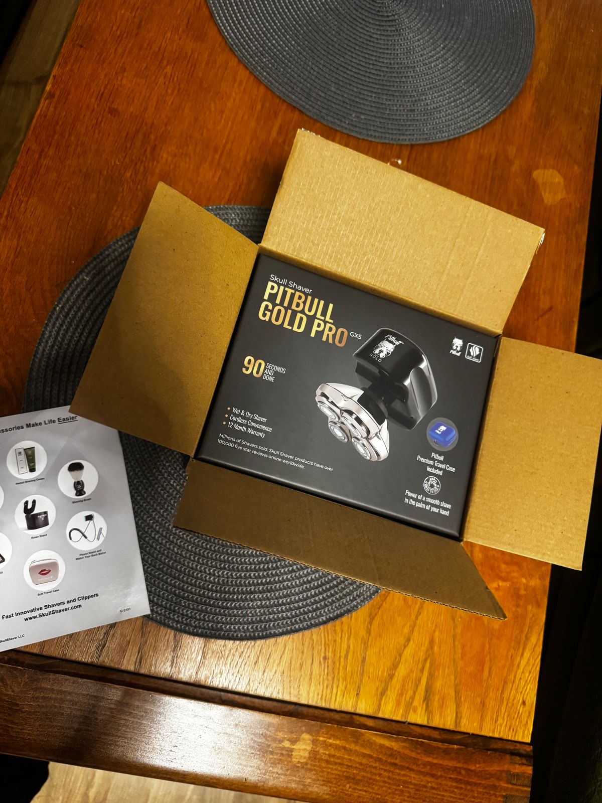 The image shows the Pitbull Gold PRO GX5 electric razor with a black and gold color scheme. It features a four-blade system and a curved handle.
