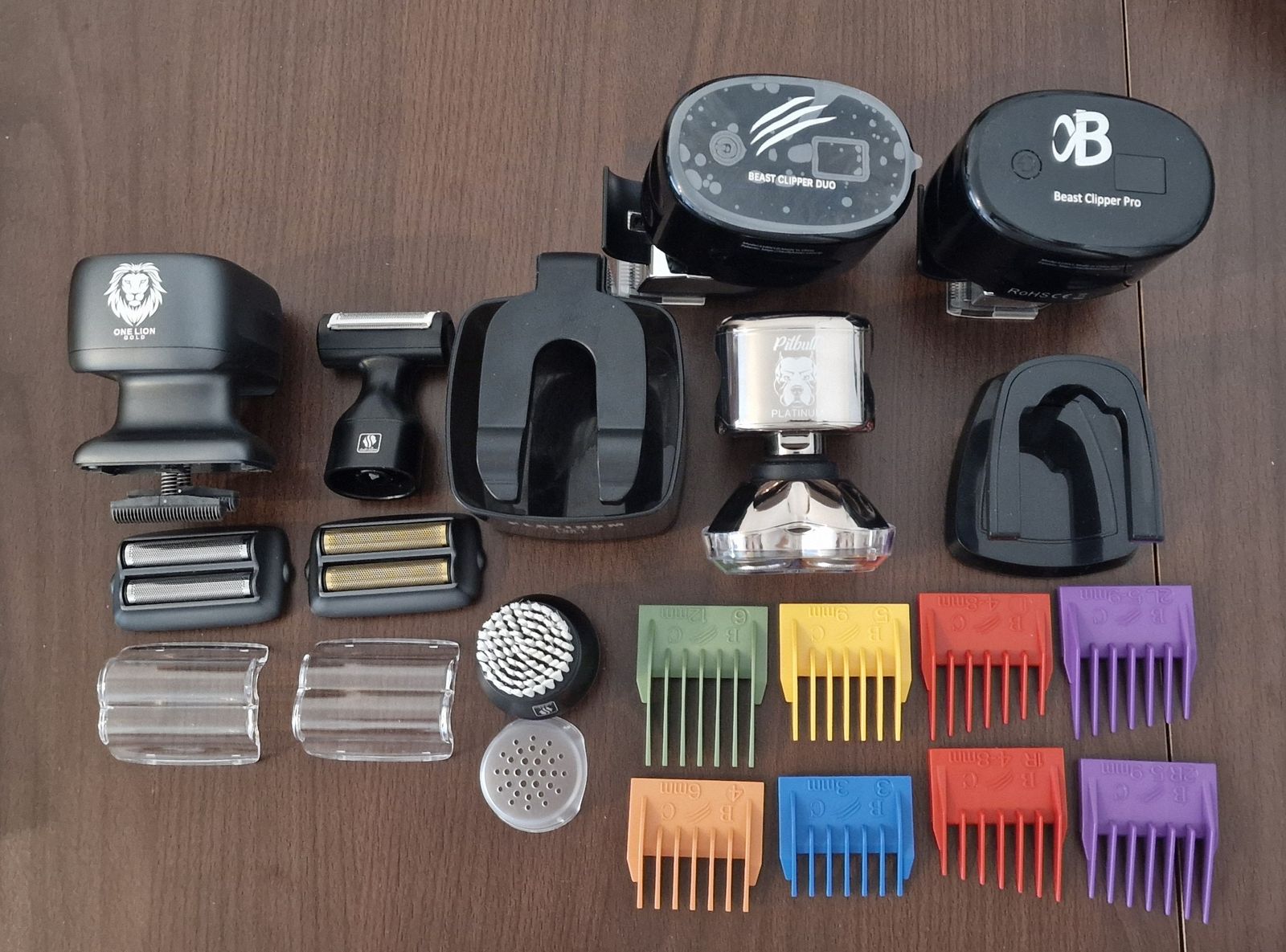I am new to the pitbull skull shaver brand, I purchased the Beast Duo and the Beast Pro versions of the hair clippers to give me the ability to cut my own hair which is very easy to do using the clippers. The clippers are supplied with various combs both for different lengths as well as side combs (never had these before in a set of hair clippers). I now own the items shown in the photo (few duplicate extra accessories not shown) as well as the recently ordered palm shaver and protective storage case in Blue as the silver coloured version is still out of stock. Beast Clipper Duo and Pro shown at the top of the photo with the various comb attachments lower bottom of the photo. ** The other items in the photo are purchased separately **