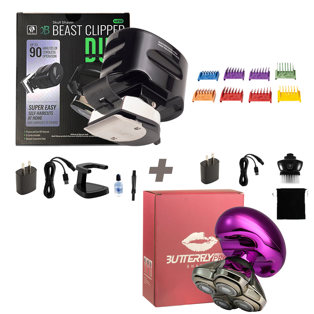 I am new to the pitbull skull shaver brand, I purchased the Beast Duo and the Beast Pro versions of the hair clippers to give me the ability to cut my own hair which is very easy to do using the clippers. The clippers are supplied with various combs both for different lengths as well as side combs (never had these before in a set of hair clippers). I now own the items shown in the photo (few duplicate extra accessories not shown) as well as the recently ordered palm shaver and protective storage case in Blue as the silver coloured version is still out of stock. Beast Clipper Duo and Pro shown at the top of the photo with the various comb attachments lower bottom of the photo. ** The other items in the photo are purchased separately **